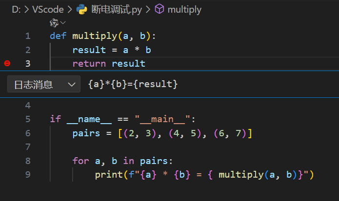 - 适用场景:需要跟踪变量变化但不想打断程序执行(比如 "记录循环中i的每次值""生产环境临时打日志")。(用{变量名}插入动态值,如当前i值:{i})。
