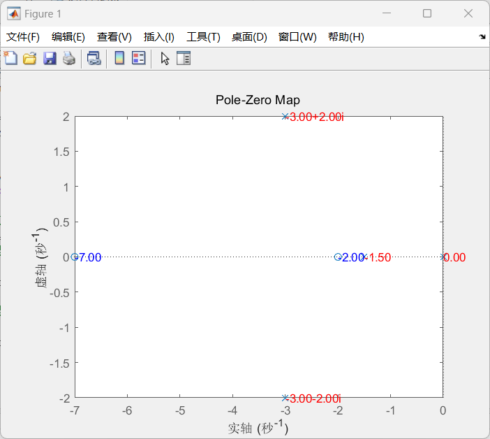 figure:创建一个新的图形窗口,用于绘制接下来的图表。pzmap(sys);:pzmap是 "Pole-Zero Map" 的缩写,是绘制零极点图的专用函数。- 它会在复平面(实轴为 x 轴,虚轴为 y 轴)上绘制出系统的所有零点和极点。