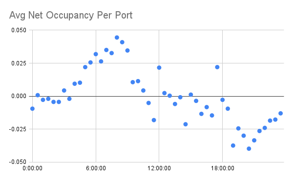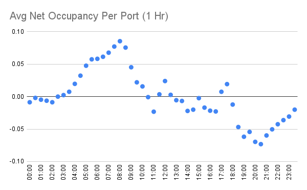 请注意,该模型仅在变化率显著(例如,高峰时段)或站点规模较大(更多端口会放大预测的变化)时才会与当前状态区分开来,而这些正是发布更新预测的正确时机。