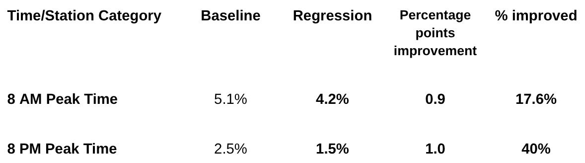 总而言之,部署回归模型使我们能够在早高峰时段减少约 20% 的错误预测,在晚高峰时段减少约 40% 的错误预测。