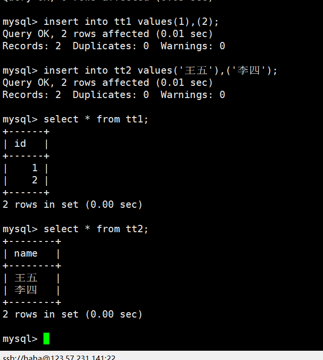 并在两个表中随便插入两条数据