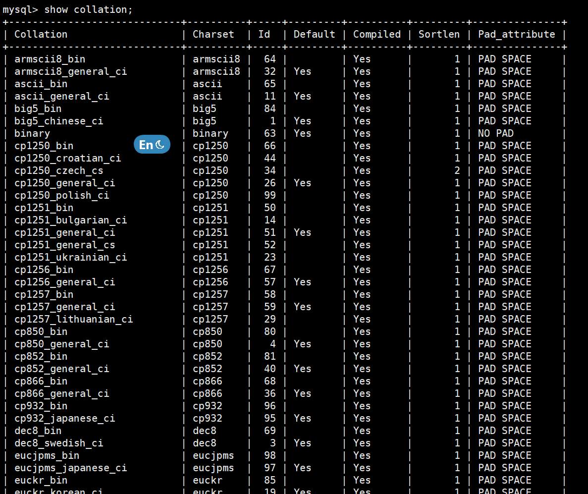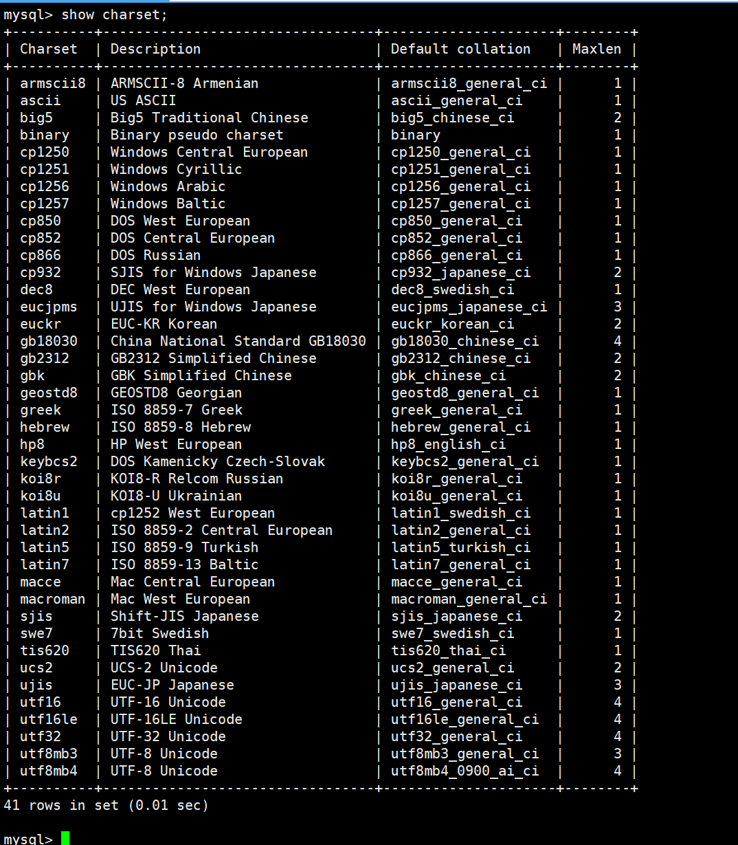 注意: 如果是在指定数据库下使用该SQL,则查看的是该数据库对应的字符集。