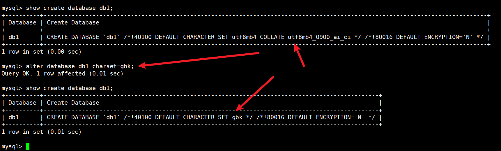 alter database db1 charset=gbk;