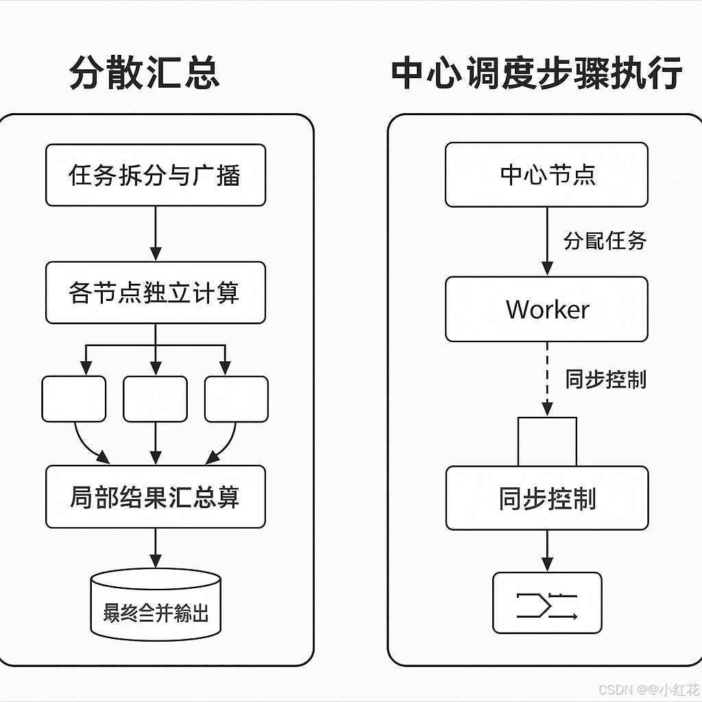 MapReduce(批处理计算):Map 阶段并行处理切片,Shuffle 按 key 分发,Reduce 汇总。吞吐高、延迟高,适合批处理。