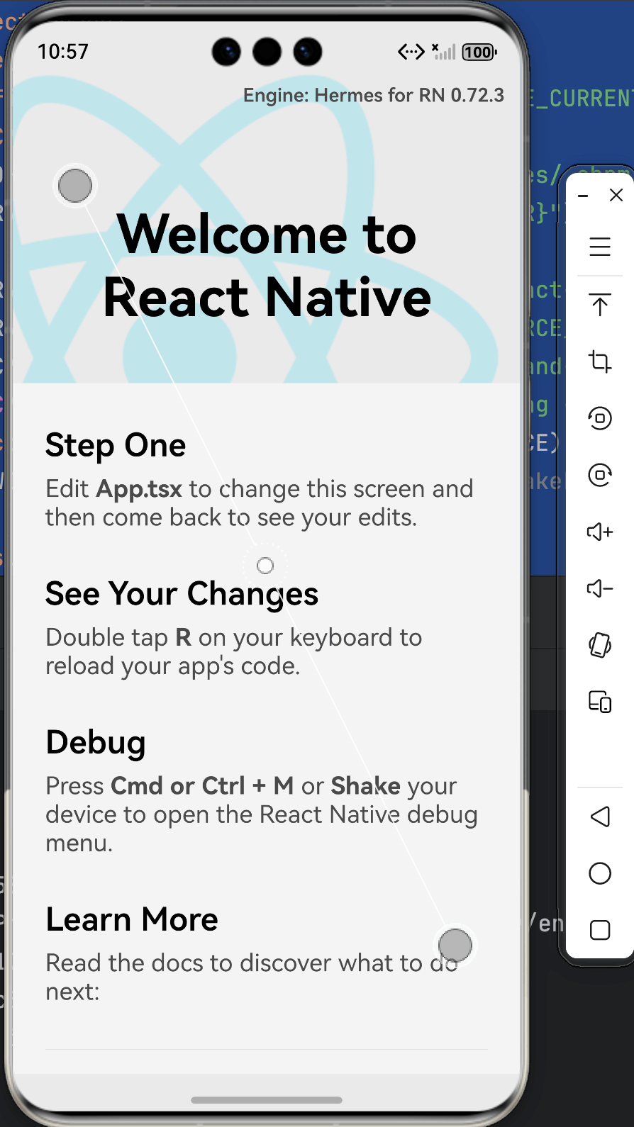 可选择一个目录,使用 React Native 内置的命令行工具来创建一个名为 "HarmonyRNTest" 的新项目。这个命令行工具不需要安装,可以直接用 node 自带的 npx 命令来创建,目前 React Native for OpenHarmony 仅支持 0.72.5 版本的 React Native: