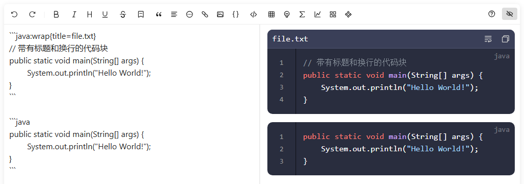 - 代码块支持设置标题行及自动换行显示