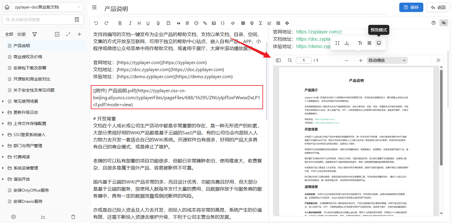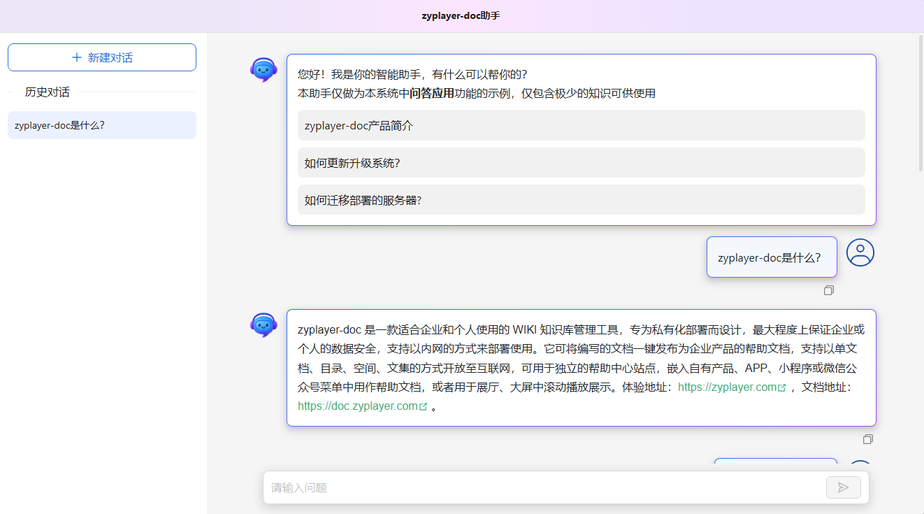 zyplayer-doc是一款适合企业和个人使用的WIKI知识库管理工具,支持在线编辑富文本、Markdown、表格、Office文档、API接口、思维导图、流程图、手绘白板,支持基于知识库的AI问答,专为私有化部署而设计,最大程度上保证企业或个人的数据安全,支持以内网的方式来部署使用。