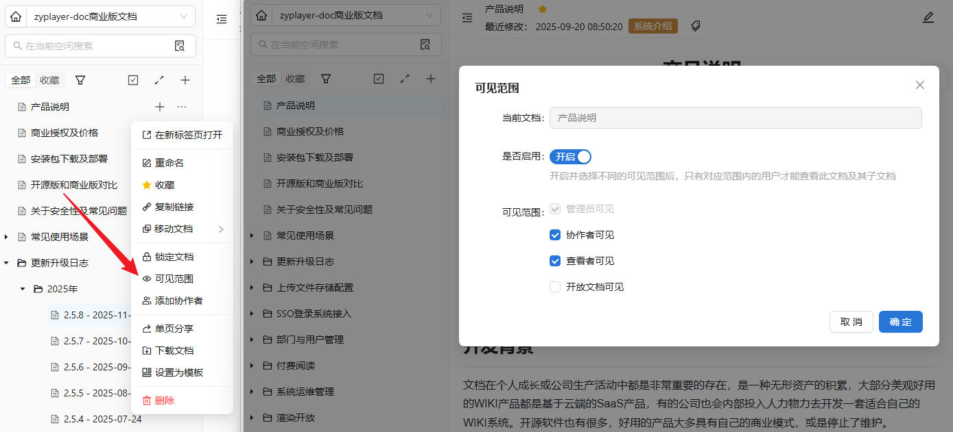 新增文档和页面的可见范围设置,支持灵活配置文档访问权限,满足不同团队和场景的权限管理需求。