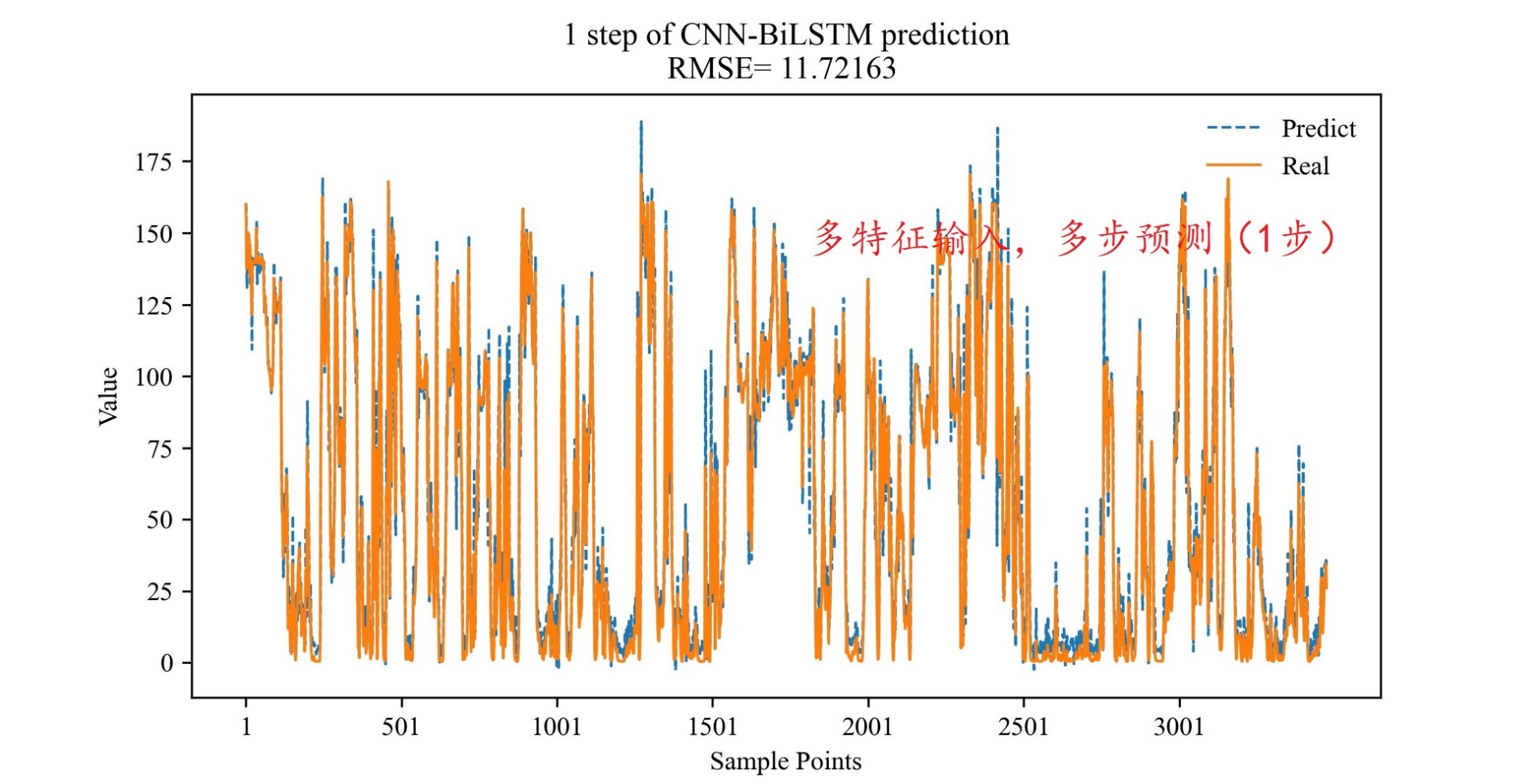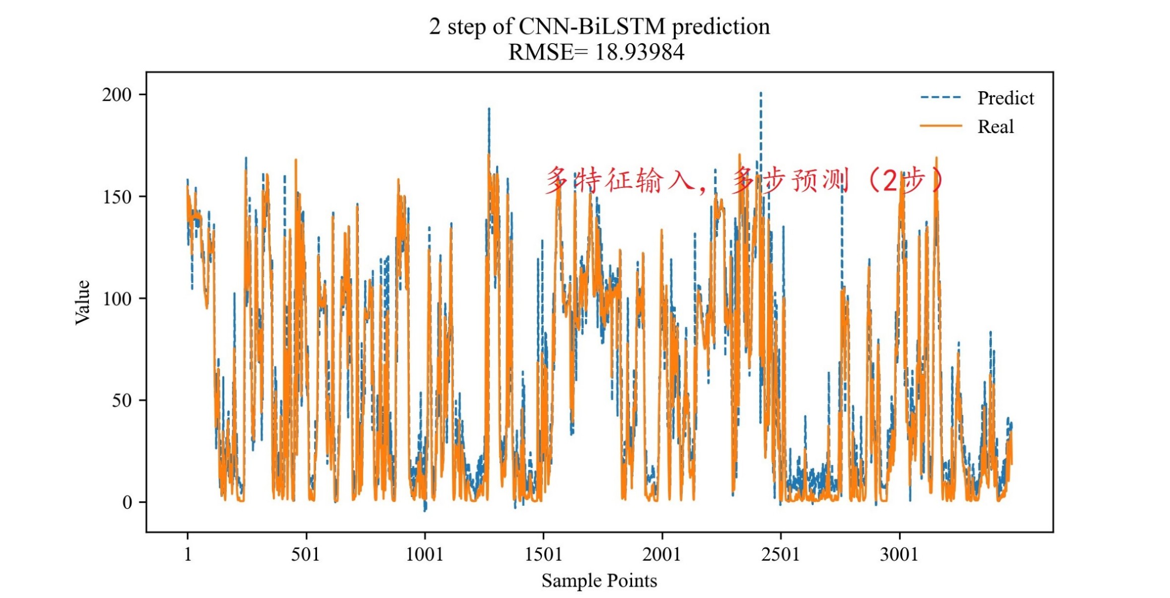 传统单一 RNN 或 LSTM 模型在处理含多尺度局部模式与长序列依赖的多特征时序预测任务中,往往存在对局部突变敏感性不足、长距离信息捕获衰减以及多步预测误差累积等问题。为提升建模能力,当前算法构建了卷积神经网络(CNN)与双向长短期记忆网络(BiLSTM)组合的混合结构:前端一维卷积与池化层侧重提取局部时间片内的短期形态特征,后端双向 LSTM 同时在正向与反向时间维上聚合长期上下文依赖,再经全连接层输出多步预测结果,实现多特征输入→多步输出的时序回归。优化过程采用标准反向传播与 Adam 优化器,结合归一化预处理与滑动窗口样本构造,增强训练稳定性与泛化能力。