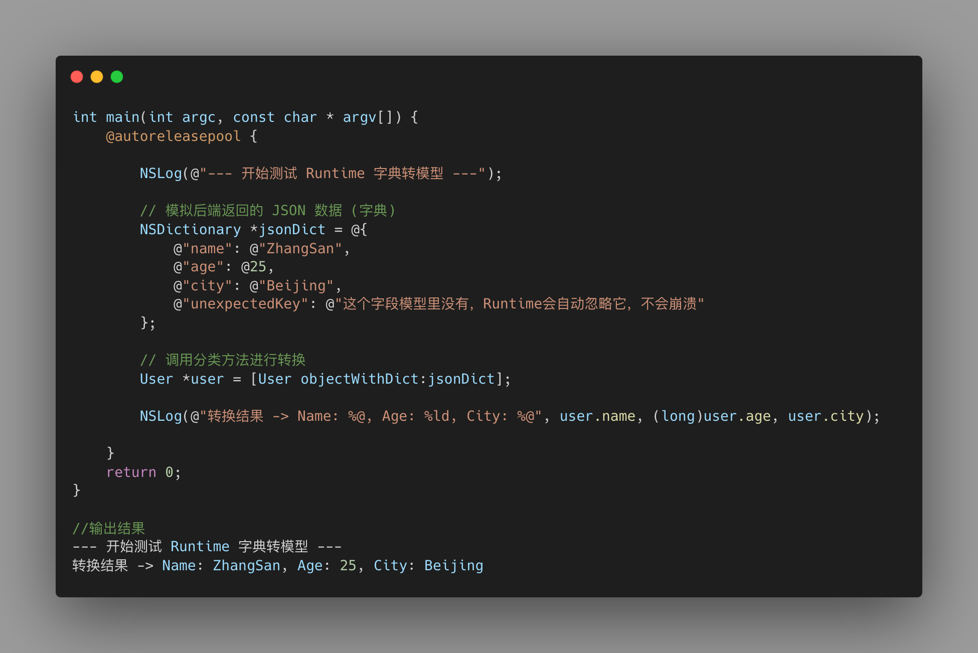 我们需要将这个字典转化为我们定义的对象模型 Model ,比如User对象,Product对象,以便在代码中使用user.name而不是dict[@"name"]
