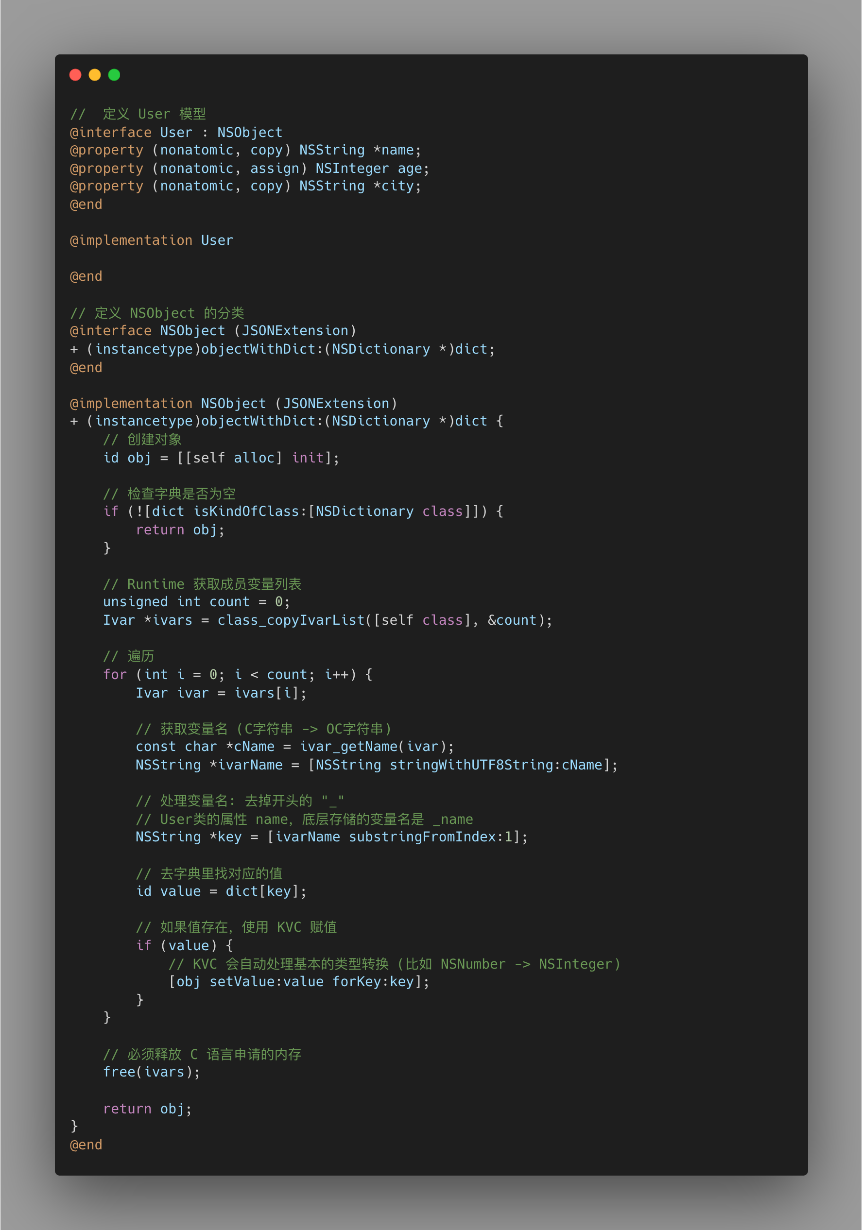 - Runtime可以遍历字典,利用KVC,把数据直接"灌入"到一个已经存在的对象实例中。