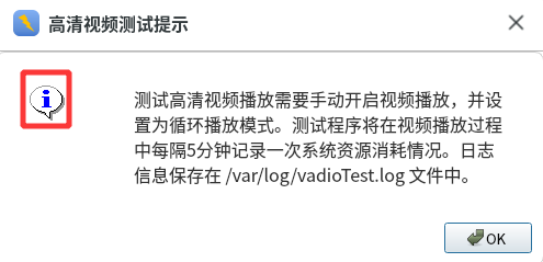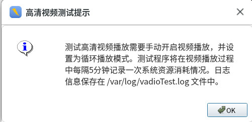 message = """测试高清视频播放需要手动开启视频播放,并设置为循环播放模式。测试程序将在视频播放过程中每隔5分钟记录一次系统资源消耗情况。日志信息保存在 /var/log/vadioTest.log 文件中。"""