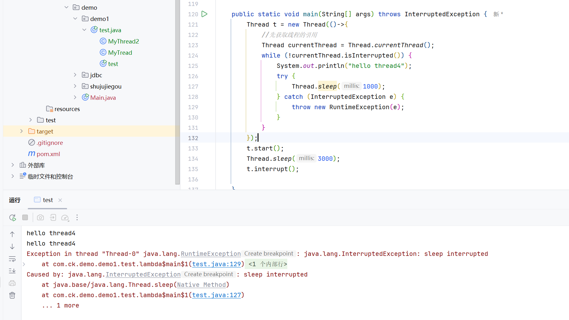 这个是因为sleep(1000)的时候,直接就interrupt了-----》Thread.sleep直接就被唤醒了,然后抛出了InterruptedException异常,由于Thread.sleep抛出的