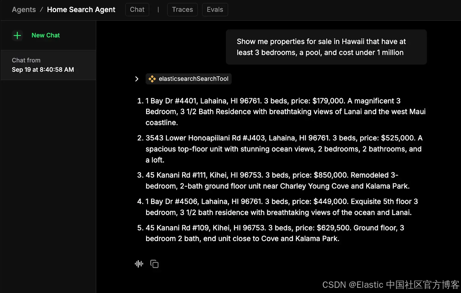 在 Mastra Framework 上运行你的 Elastic Agents 后,你现在可以在 home-search-agent(允许你进行房产搜索)和 home-search-agent-ltr-comparison(允许你直接看到基于个性化数据训练的好处)之间进行选择。