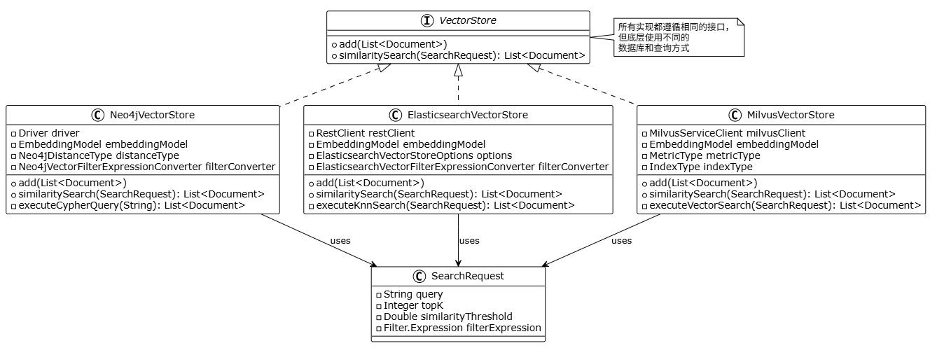 这种设计让所有向量数据库都使用相同的 API,用户可以轻松切换不同的实现。