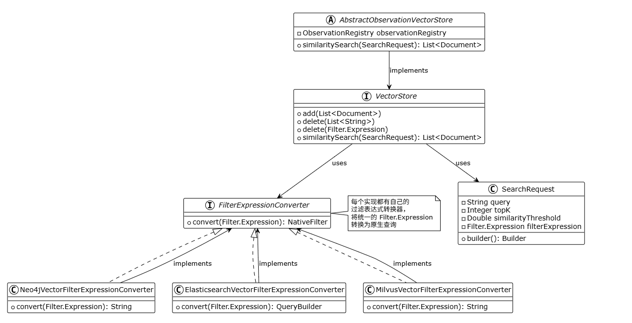 每个实现都有自己的 FilterExpressionConverter,将统一的 Filter.Expression 转换为原生查询:
