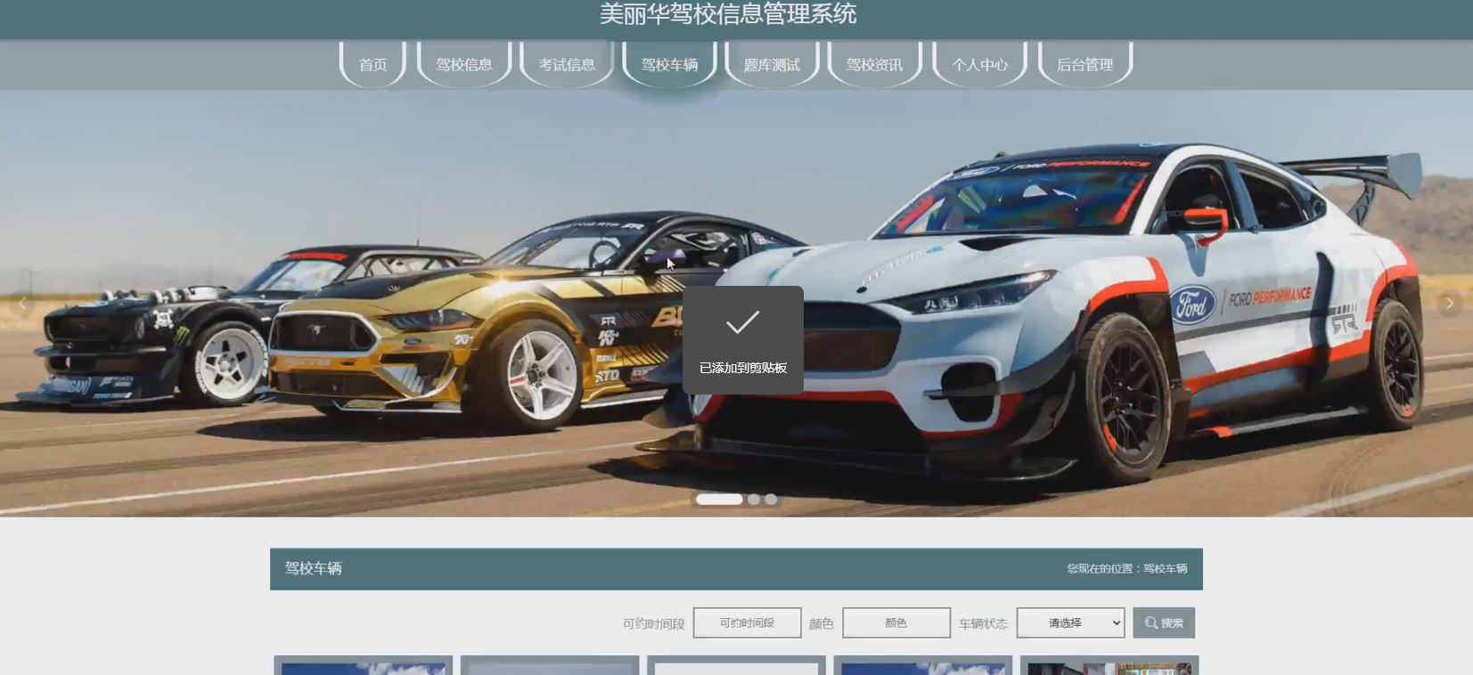 管理驾校所有教学车辆的信息,包括车牌号、车型、购置时间、车况、保险期限、年检情况、维修记录等;实时更新车辆的使用状态(空闲、培训中、维修中、报废等);支持按车型、车况等条件查询车辆信息;提醒管理员及时办理车辆保险、年检等手续,确保车辆合规使用。