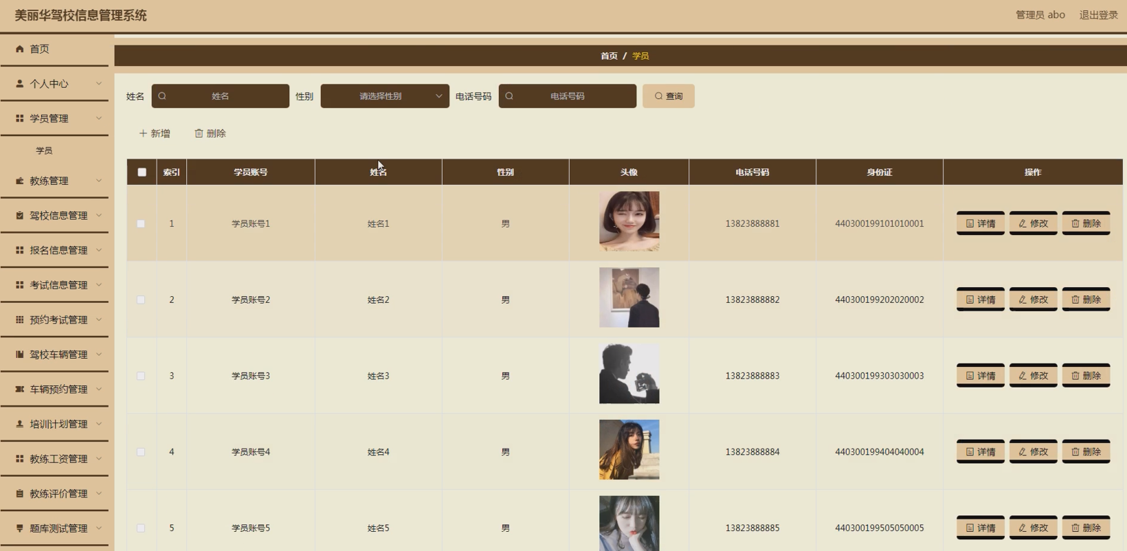 系统项目功能:学员,教练,驾校信息,报名信息,考试信息,预约考试,驾校车辆,车辆预约,培训计划,教练工资,教练评价