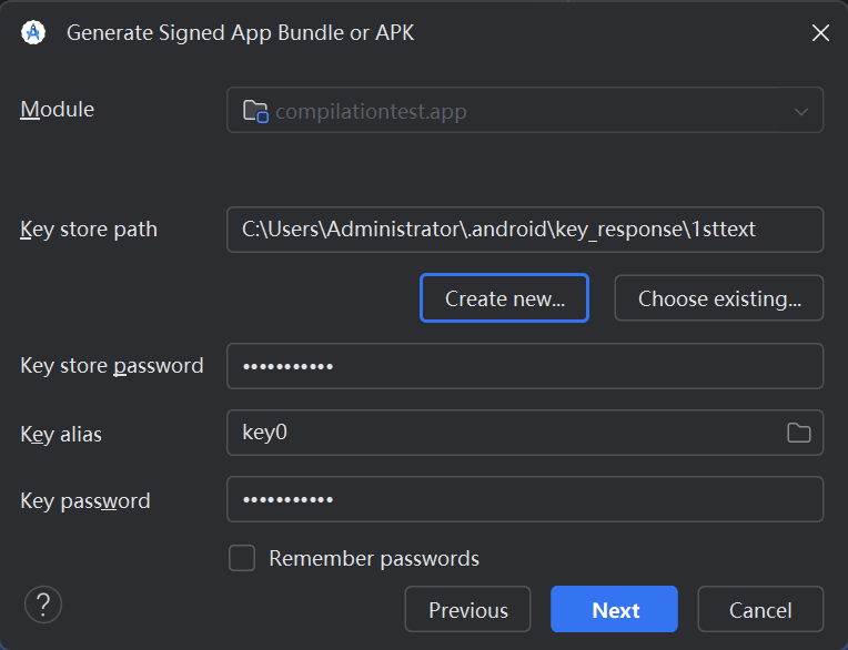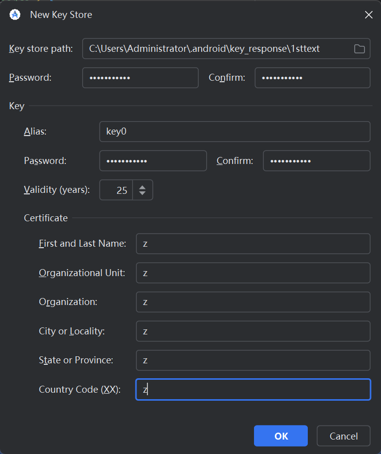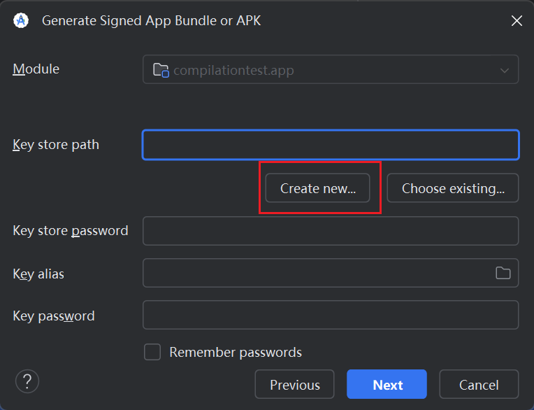 - 若没有密钥库,点击 "Create new..." 填写保存路径、密码、别名、有效期,完成后回到向导。