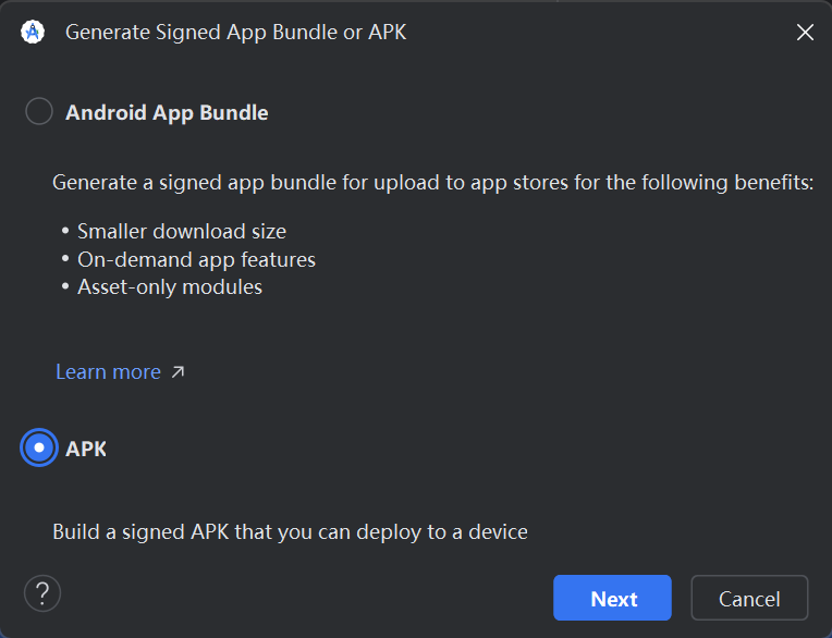 根据目标分发渠道(直接分发或应用商店)处理。若要上 Google Play,建议改为生成 AAB:Build > Generate Signed Bundle / APK... 选择 Android App Bundle。