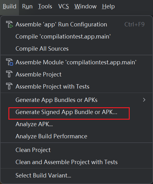 - Android Studio 菜单 Build > Generate Signed Bundle / APK...。