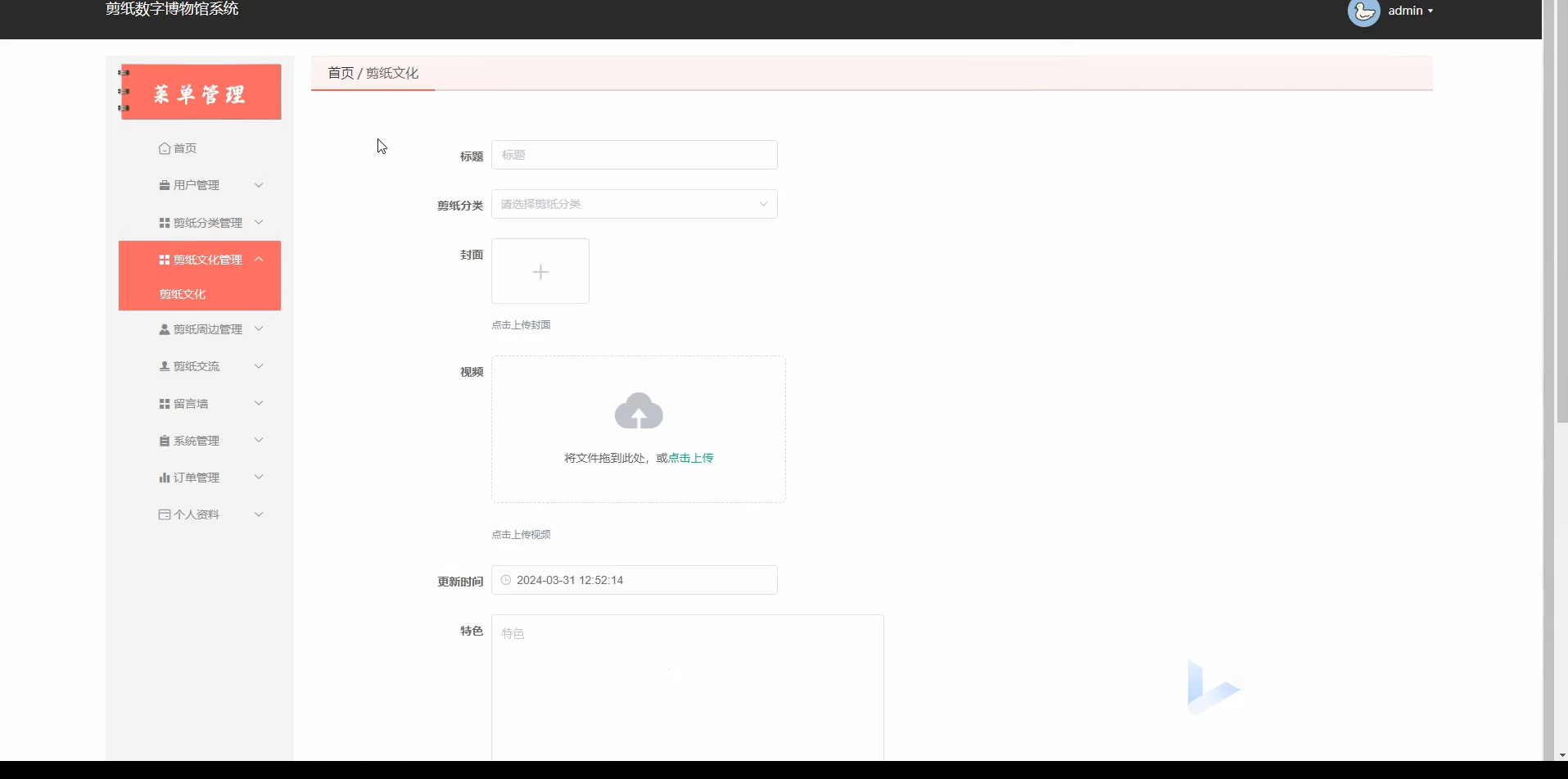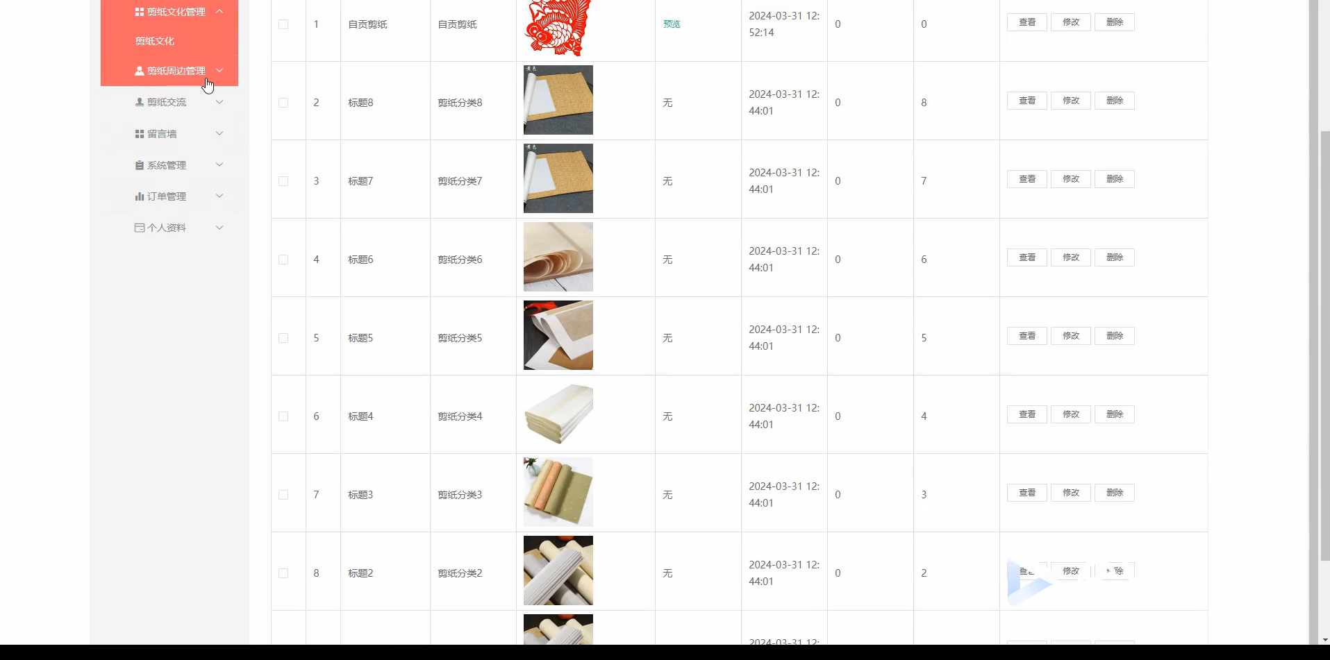 - 剪纸分类管理模块:根据地域、题材、技法等对剪纸作品进行分类,方便用户查找和浏览。