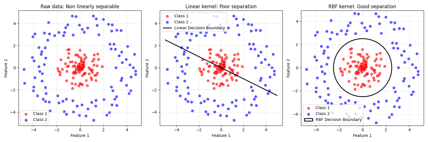 有些数据在原始特征空间中线性不可分,但在更高维空间中可能变得线性可分。