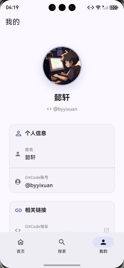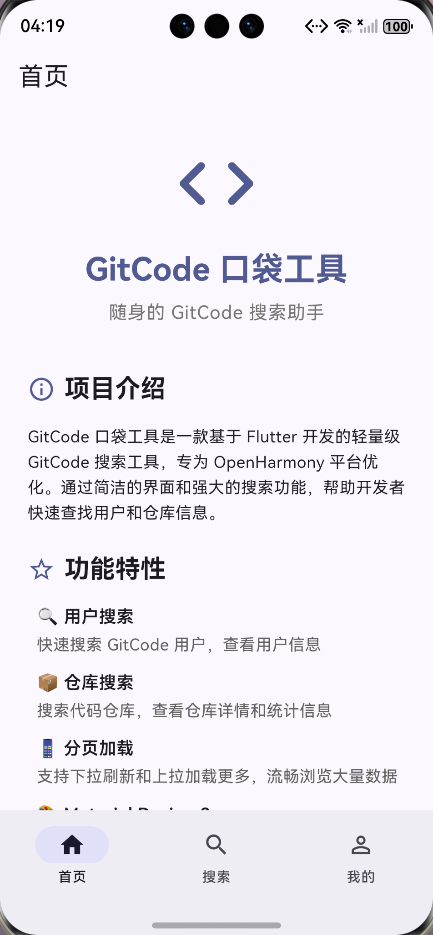 今天很高兴为大家分享 GitCode 口袋工具 的最新版本(v1.0.1)。这是一个基于 Flutter 开发的轻量级 GitCode 搜索工具,支持搜索用户和仓库,提供流畅的分页加载体验。项目专为 OpenHarmony 平台优化。