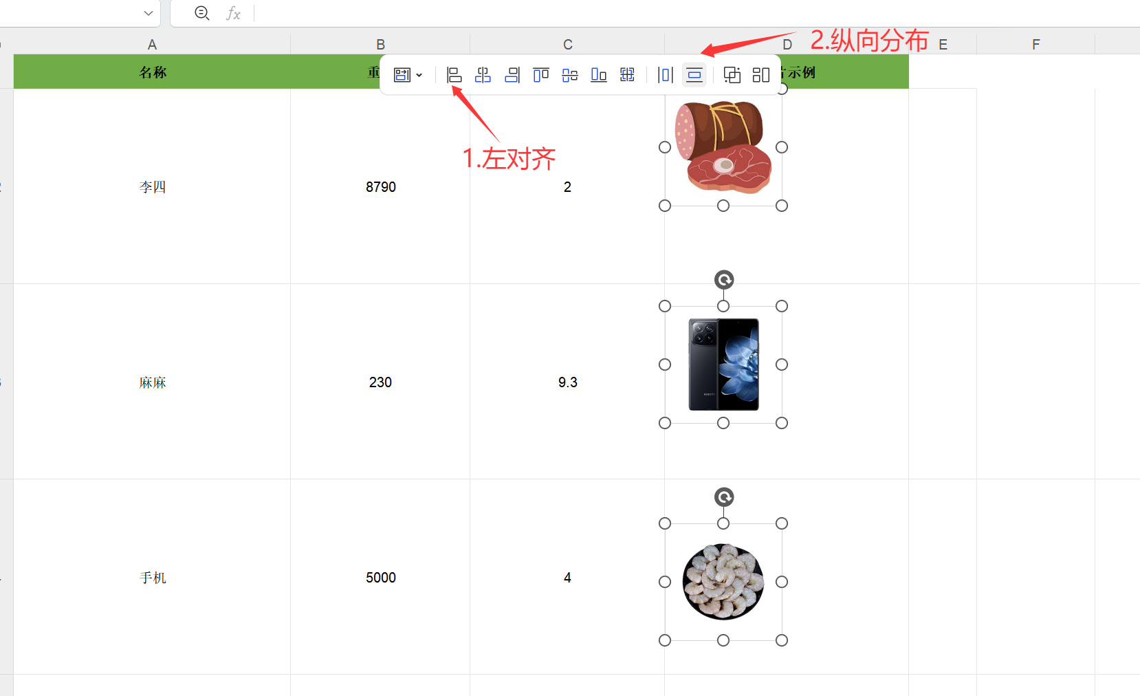 然后ctrl+A全选图片, 然后分别点击 左对齐,纵向分布。 此时图片就排版在单元格的位置了,如下: