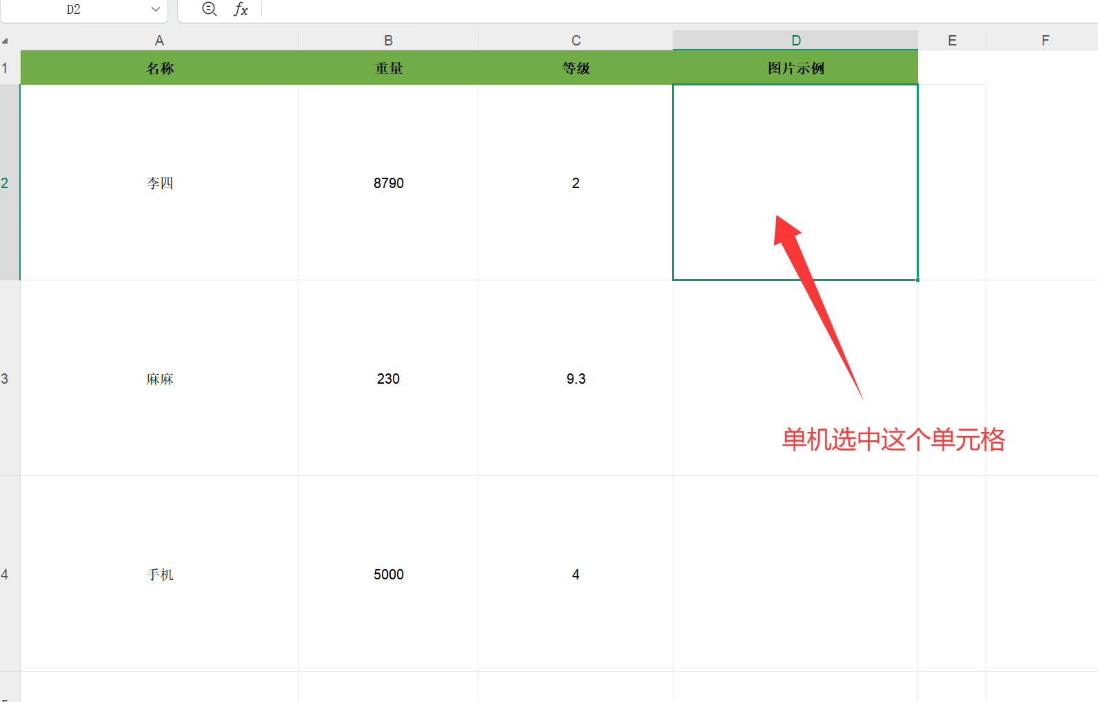 开门见山, 首先用wps打开excel, 选中要插入图片列的第一个单元格: