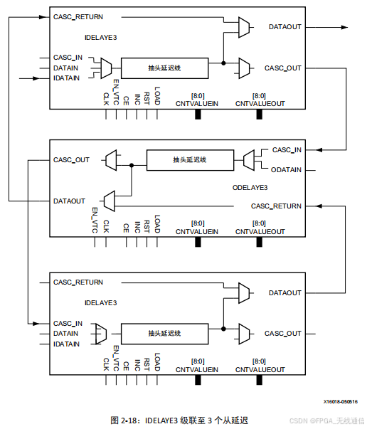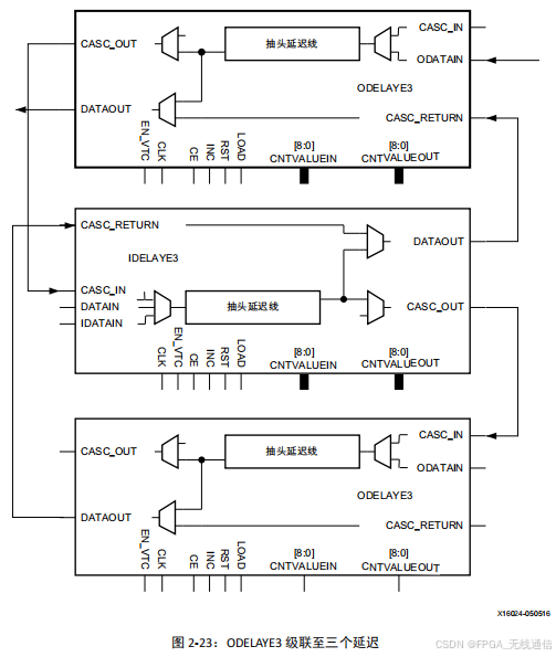 上图中可以看到,IDELAYE3的级联操作需要ODELAYE3一起穿插使用,第一级CASCADE参数设置为MASTER,中间级设置为SLAVE_MIDDLE,最后一级设置为SLAVE_END,级联组件之间的布线是专用高速布线,IDELAYE3 或 ODELAYE3 级联的固定内部插入延迟总量是初始插入延迟与级联插入延迟的总和。此延迟按 IDELAYE3 和 ODELAYE3 级联次数而成倍增加。