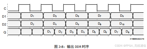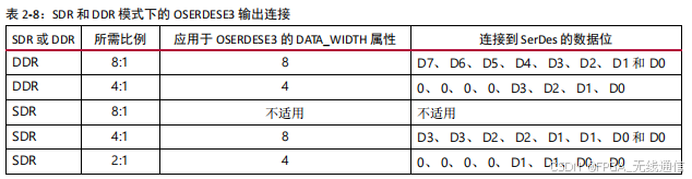 OSERDESE3 可以在 SDR 模式下按 2 或 4 位对传出信号进行串行化,或在 DDR 模式下按 4 或 8 位进行串行化。搭配 SDR 时控一起使用时, DATA_WIDTH 属性应设置为所需宽度的两倍,并且要传输的数据应同时应用于 2 个管脚。