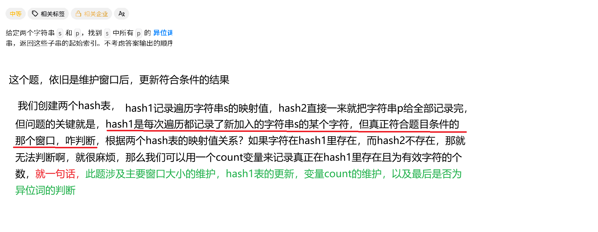 int count1=0;//用于记录有效字符个数,也就是hash2表里存在时,hash1表又要对其增加或删除时,就需要对count1进行维护,这也是后面判断是否是字符串p的字母异位词的关键!