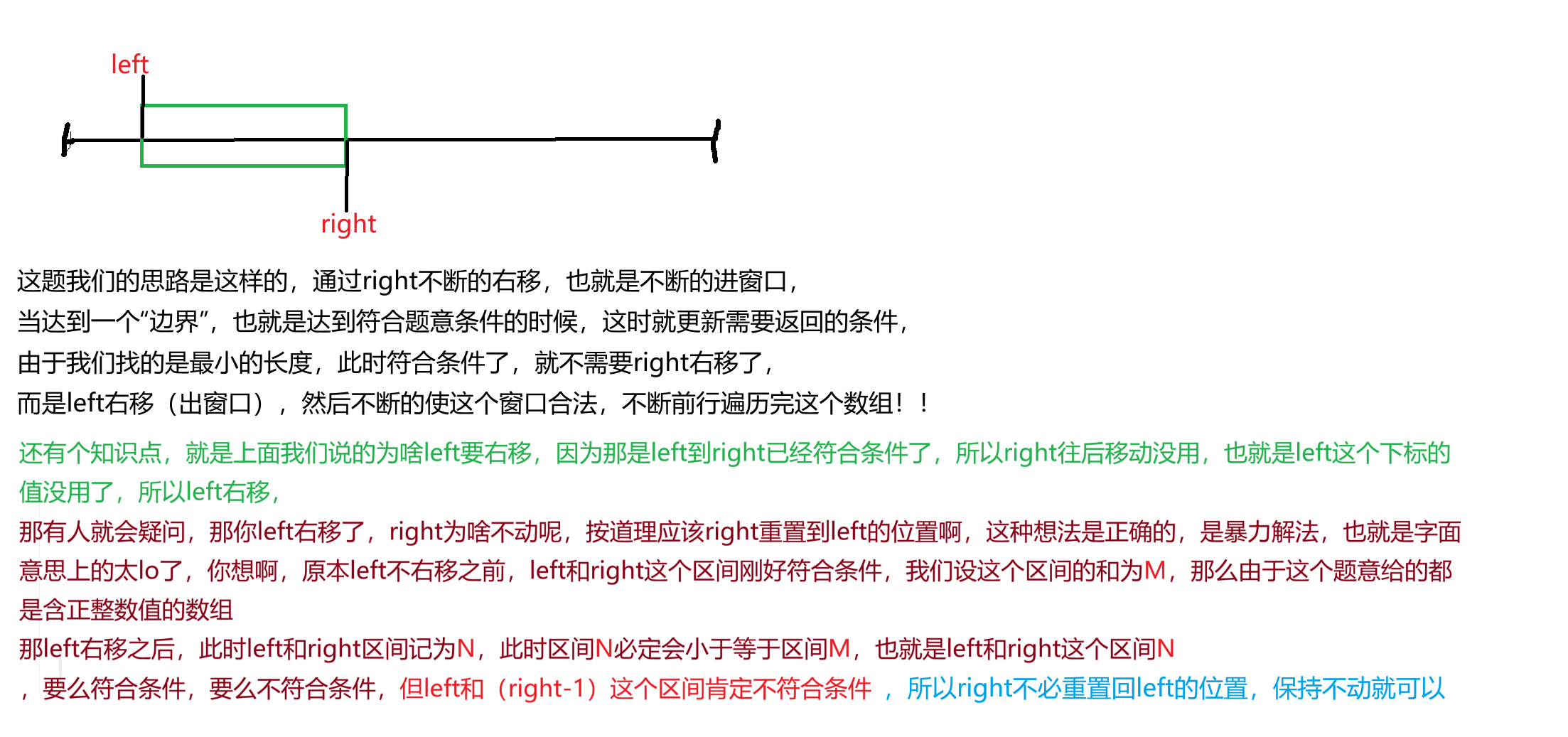 我们这一个题和前一道题有点不同,虽然都是用到了滑动窗口,但这个题我们需要在每次维护窗口的时候之后,也就是出了维护窗口那个循环后,才更新结果 ,而前一道题,是维护窗口的那个循环里,一开始就更新结果,两者本质区别就是这题维护的是使其窗口合法 ,而前一道题是将合法的窗口维护成不合法的窗口,但在每次维护成不合法的窗口之前,先更新结果,使right能不断右移,达到只要窗口一合法,就更新结果,然后使其维护成不合法的窗口,"驱动"这个窗口不断滑动!!