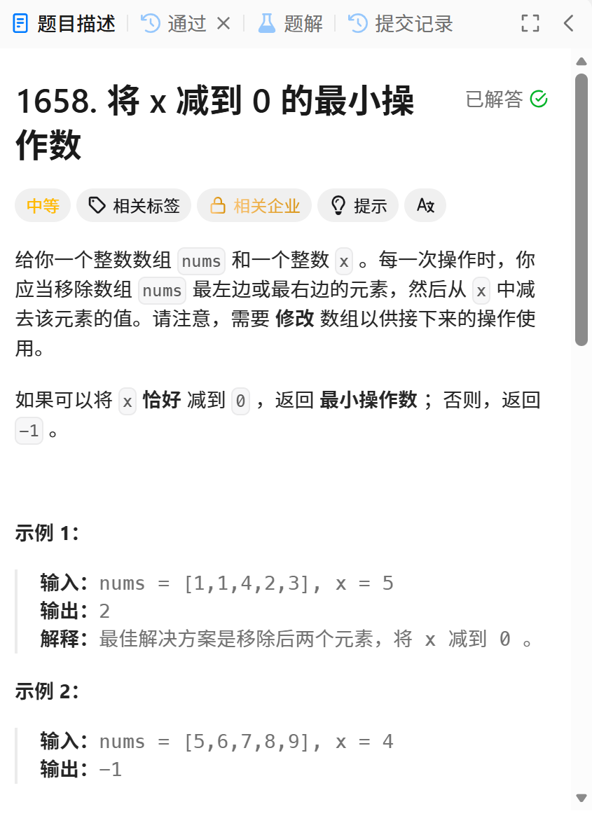 https://leetcode.cn/problems/minimum-operations-to-reduce-x-to-zero/