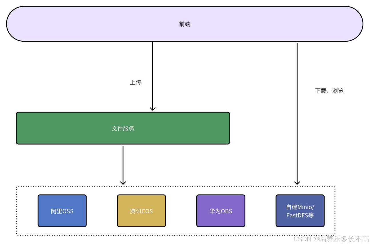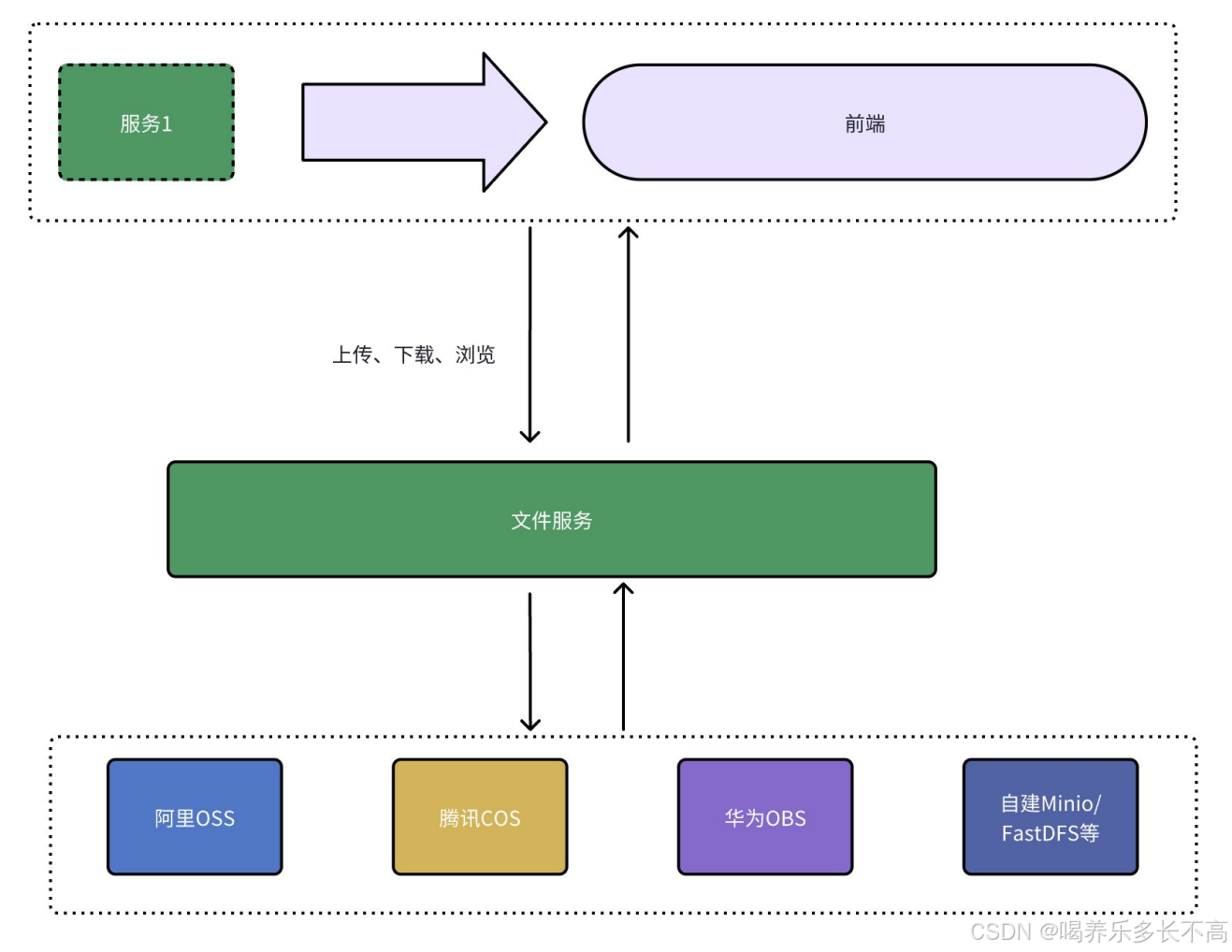 这种方式提供一个独立的文件微服务,文件微服务向业务微服务提供统一的上传、下载、查看接口,不同的业务微服务调用方式相同,并且屏蔽了底层调用OSS服务(或其他厂商所提供对象存储服务的)的接口,即使以后迁移OSS服务商,业务微服务层面的系统也不需要变动。