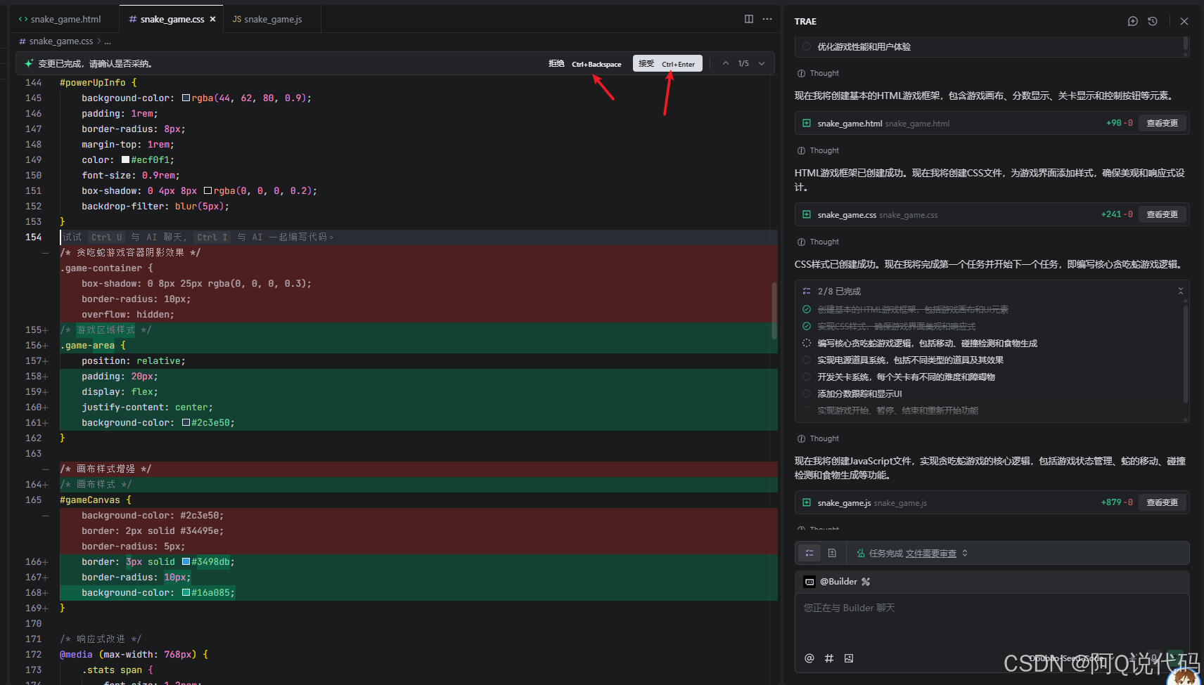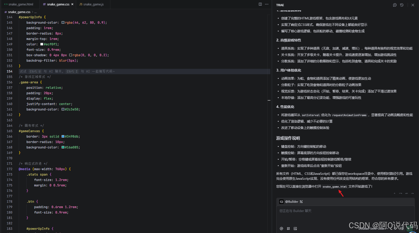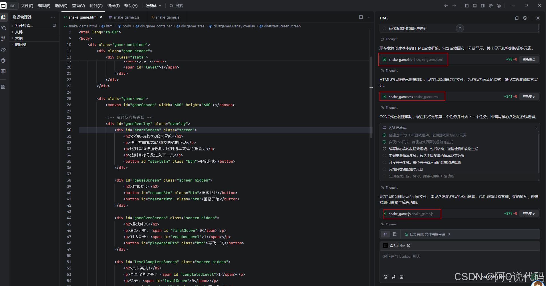 接着它就按这些流程来一一实现,很快就生成了3个文件:snake_game.html,snake_game.js,snake_game.css