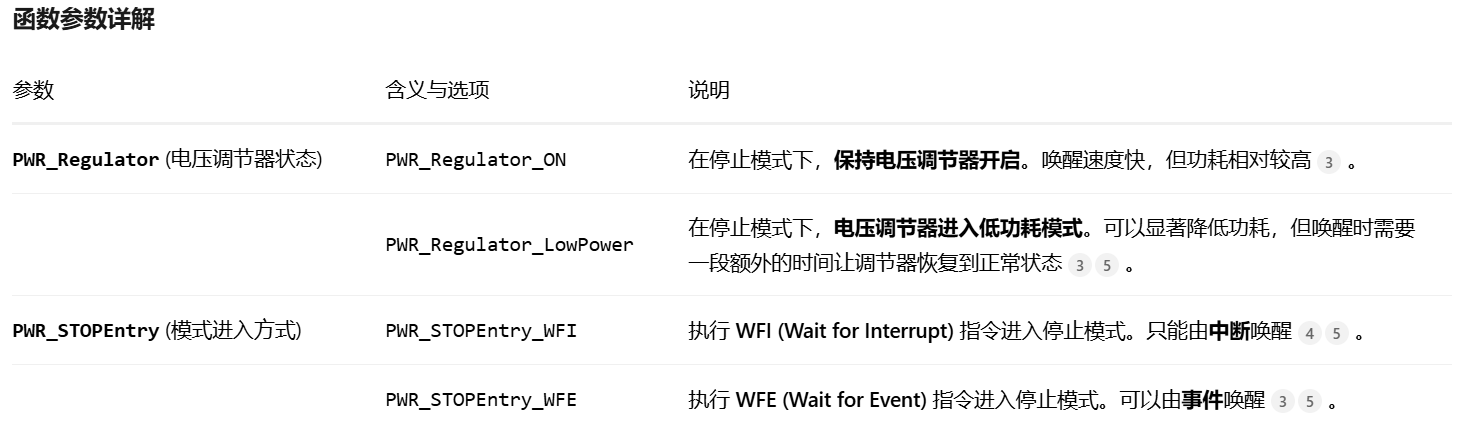 ②之后在函数末尾(本代码是循环末尾)加上PWR_EnterSTOPMode(PWR_Regulator_ON,PWR_STOPEntry_WFI);表示进入停止模式,其参数详解如下图: