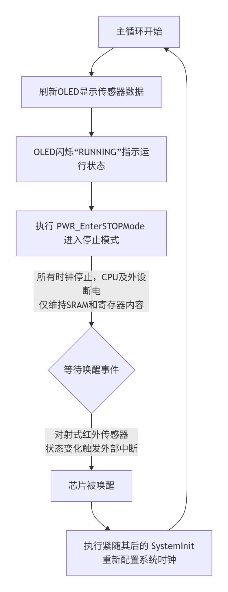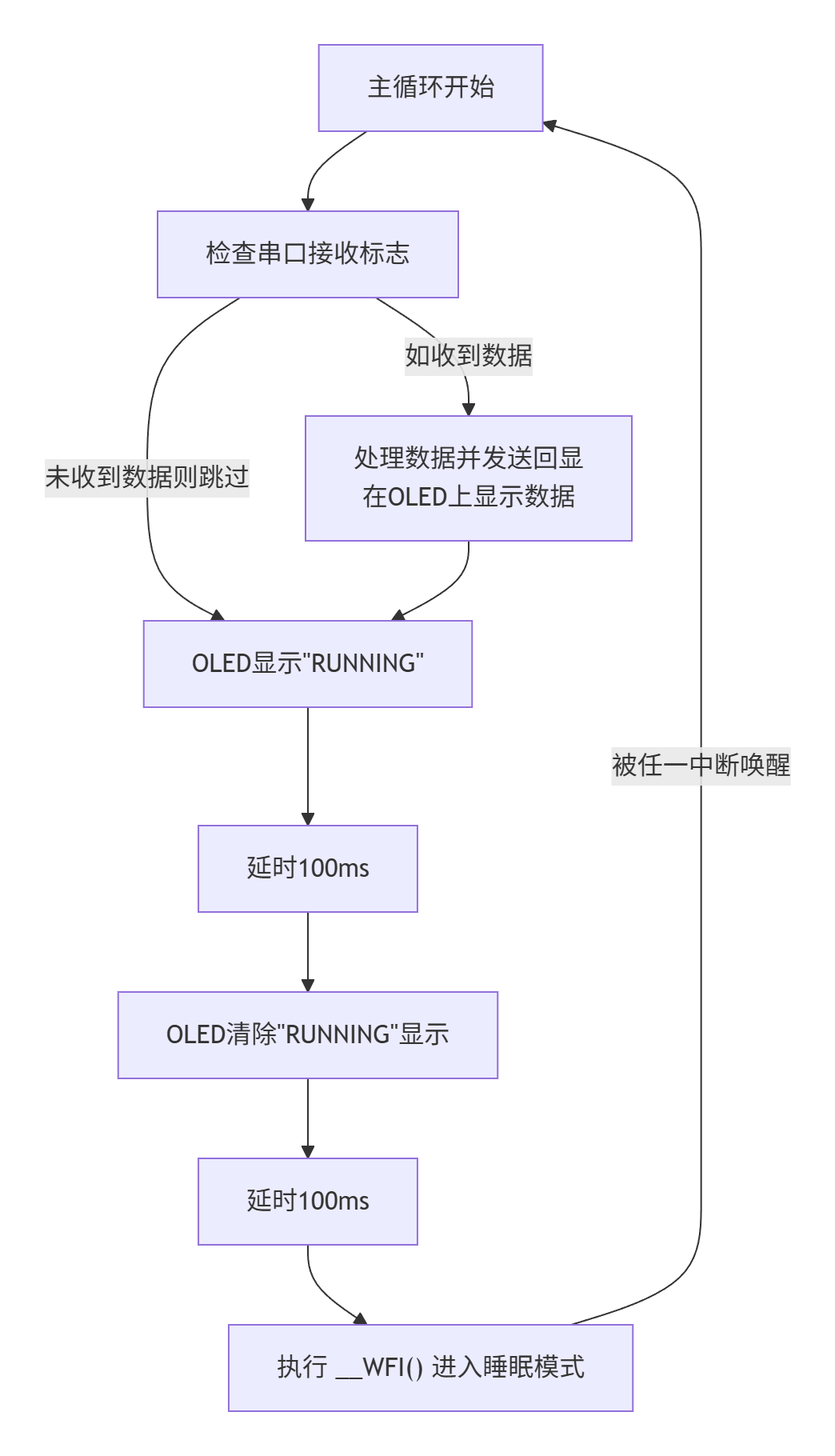 ③设备在执行 __WFI()指令进入睡眠模式后,一旦被唤醒,程序会紧接着从 __WFI()指令之后的下一条代码继续执行,在此代码中也就是回到主循环开头继续向下执行.