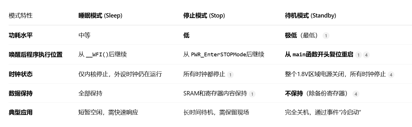 ③低功耗模式包括睡眠模式(Sleep)、停机模式(Stop)和待机模式(Standby),可在系统空闲时,降低STM32的功耗,延长设备使用时间.