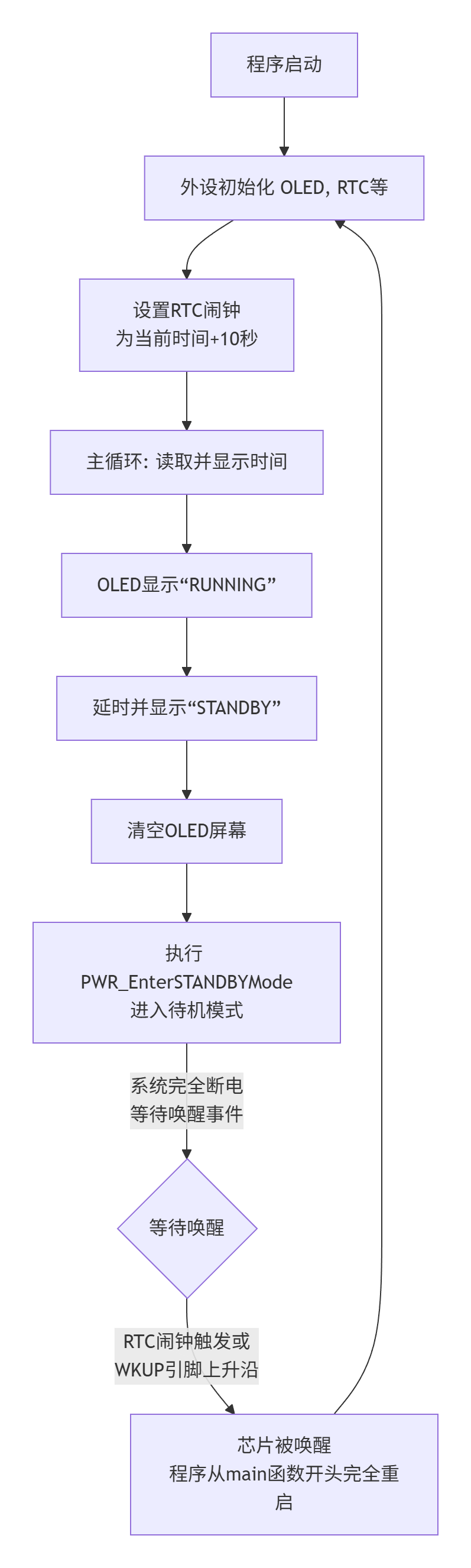 ③从待机模式唤醒相当于一次硬件复位。程序不会从 PWR_EnterSTANDBYMode()后面继续执行,而是从 main函数的第一行代码重新开始执行。这就是为什么唤醒后所有硬件都需要重新初始化。