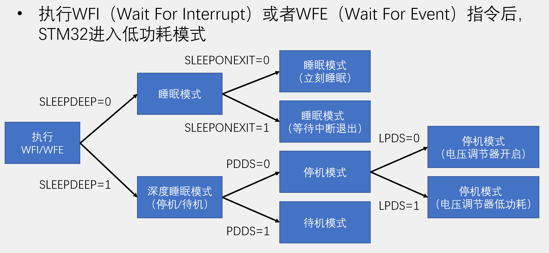 ⑦WFE指令进入停止模式,可被任意一个EXTI事件唤醒.