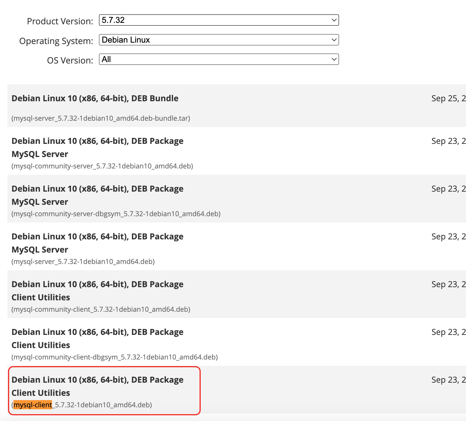 下载地址:https://downloads.mysql.com/archives/get/p/23/file/mysql-client_5.7.32-1debian10_amd64.deb