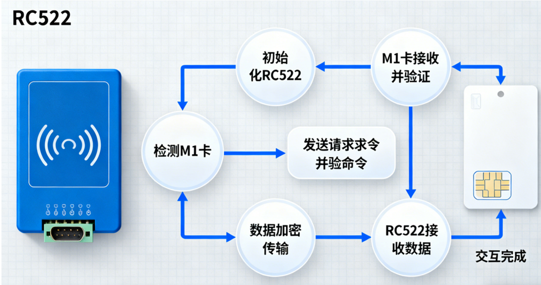 ①射频场产生:RC522 通过天线线圈产生 13.56MHz 的射频场,当 M1 卡进入射频场时,卡片内的 LC 谐振电路(13.56MHz)感应产生感应电流,为卡片内的芯片供电
