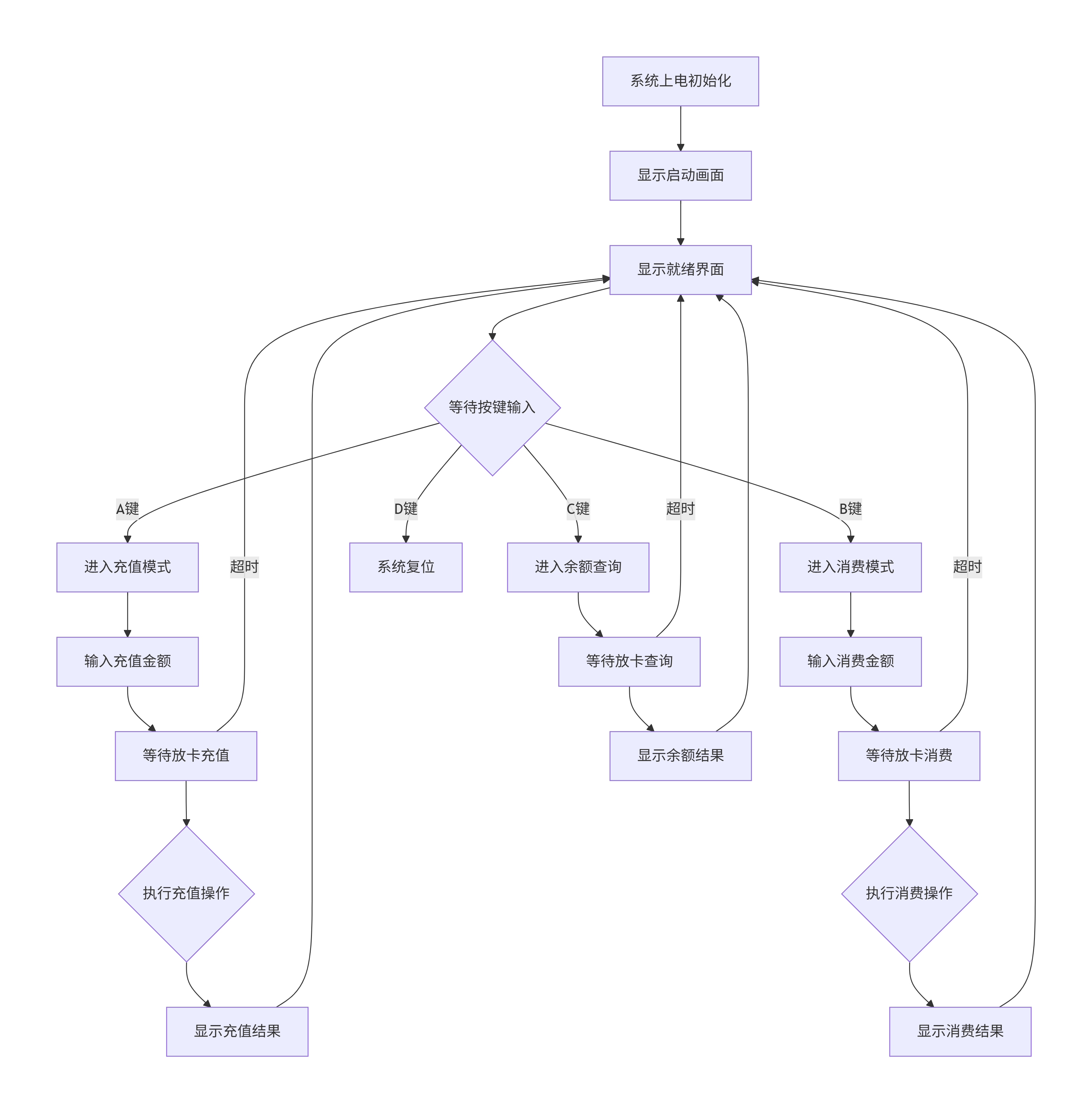 A键进入充值模式,输入金额后按#确认;B键进入消费模式,输入金额后按#确认;C键进入余额查询,等待放卡;D键系统复位,返回初始状态