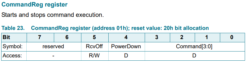 | 0x01 | CommandReg | 命令寄存器,存储待执行的命令 | 发送复位(PCD_RESETPHASE)、认证、读写命令 |