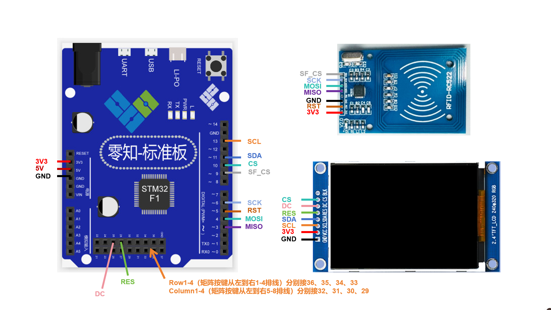 RFID-RC522 模块、ST7789 显示屏和矩阵键盘通过杜邦线连接到零知标准板的指定 GPIO 引脚,注意电源和共地连接