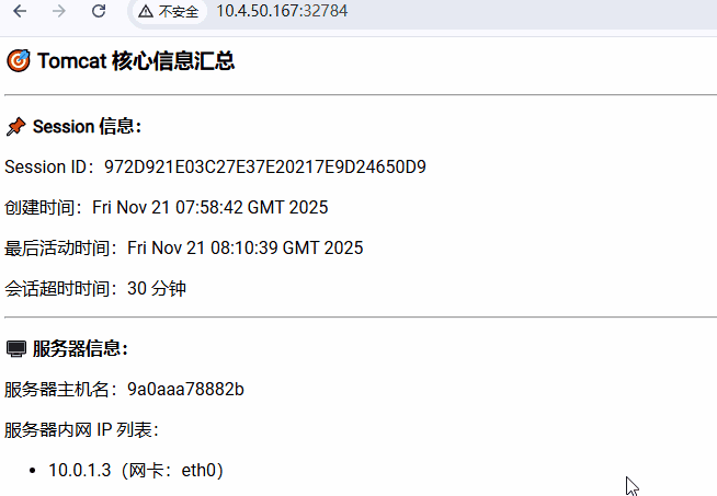 bash[root@localhost nginx]# docker ps CONTAINER ID IMAGE COMMAND CREATED STATUS PORTS NAMES 7ef5fc81d772 nginx:1.29.3 "/data/nginx/sbin/ng..." 5 minutes ago Up About a minute 0.0.0.0:32784->8080/tcp, :::32784->8080/tcp n2 # 浏览器访问 http://本机ip:32784 Session ID:3588FA1B135C8F53B54FC354A6A7DDE3 服务器主机名:bc0ab8300a65 服务器内网 IP 列表:10.0.1.4(网卡:eth0) # sessionID 会话保持成功 服务器主机名:9a0aaa78882b 服务器内网 IP 列表:10.0.1.3(网卡:eth0)