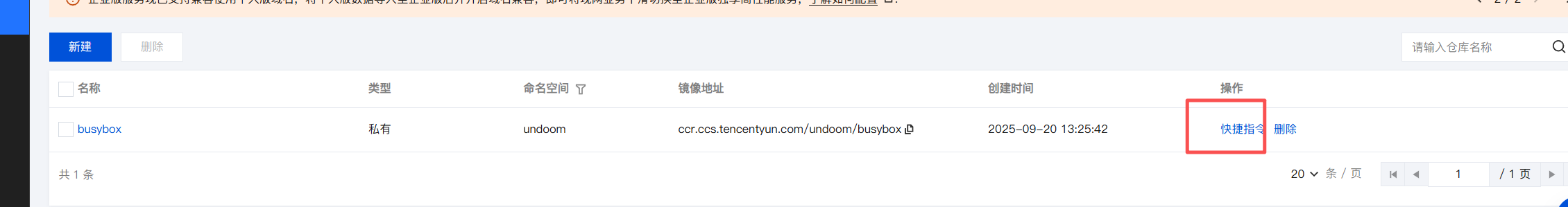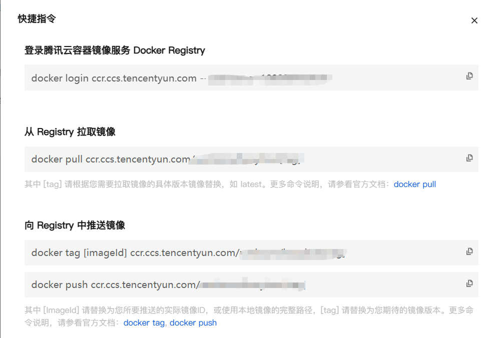 创建成功后,腾讯云会提供详细的操作指引,包括登录、拉取和推送的具体命令。这些命令中包含了腾讯云特有的 Registry 地址(如 ccr.ccs.tencentyun.com)。