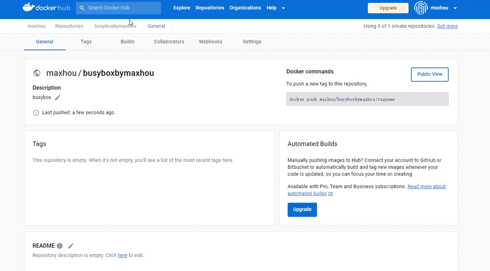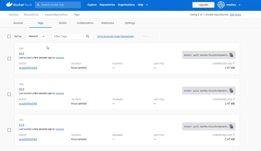 推送完成后,刷新 Docker Hub 网页,即可在 Tags 页面看到刚刚上传的 v1.0 镜像。